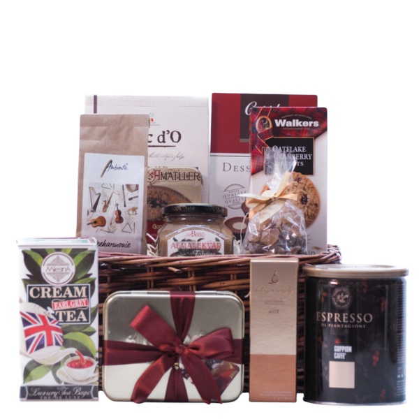 A kosárban a legjobb minőségű skót vajaskeksz, olasz kávé, válogatott teák, gyümölcsös lekvár és belga csokoládékapott helyet. Ezek az ízek garantáltan elvarázsolják az ínyenceket és a klasszikus finomságok kedvelőit egyaránt.