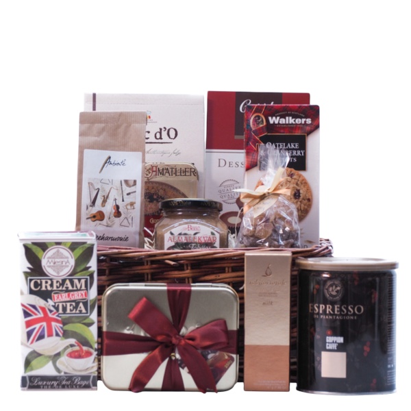 A kosár gondosan összeválogatott termékei között megtalálod a legfinomabb skót vajas kekszeket, aromás olasz kávét, különleges teákat, házi készítésű lekvárokat és prémium belga csokoládékat.