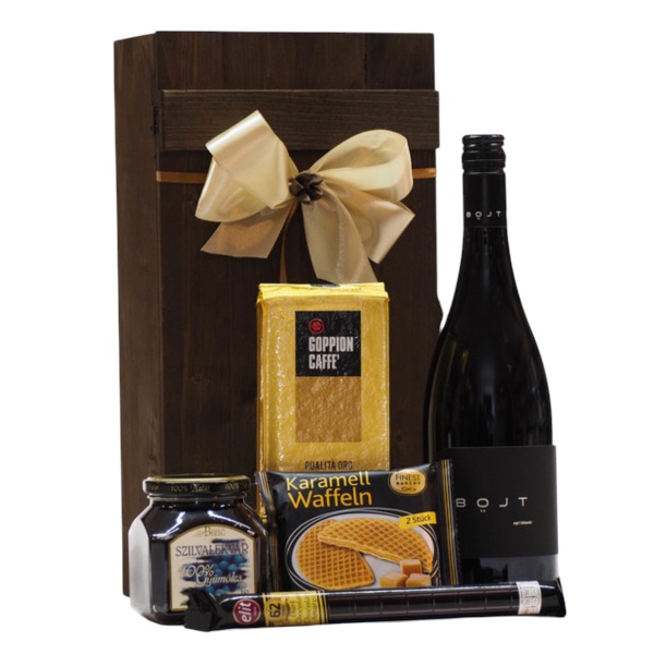 A rusztikus fadoboz elegáns megjelenése már önmagában is garantálja a sikert, de a gondosan válogatott tartalom teszi igazán emlékezetessé. A karakteres Egri bikavér, a prémium olasz kávé, az üstben főzött szilvalekvár, valamint a minőségi csokoládé és a karamellás belga waffle egyaránt olyan ínyencségek, amelyekkel egyszerűen nem lehet mellényúlni.
