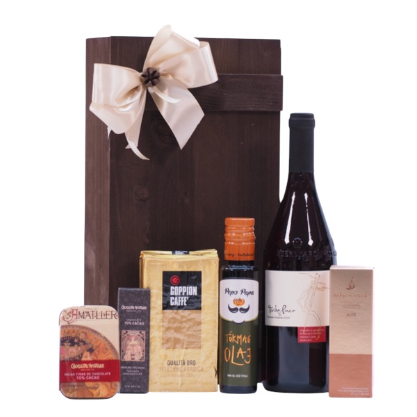 Ajándékcsomagunkban helyet kapott egy aromás olasz kávé, egy elegáns vörösbor, valamint a konyhában sokoldalúan használható, ízeket kiemelő tökmagolaj. A különleges összeállítást egy magas kakaótartalmú Amatller spanyol étcsokoládé és egy sós karamellás fügés ínyencség teszi igazán egyedivé.