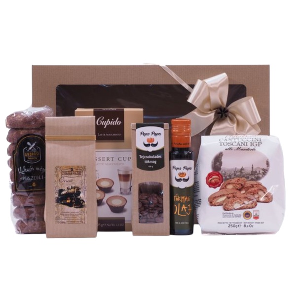 Egy kis apróság, egy kis kedvesség. Vannak alkalmak, amikor nincsen szükség másra. Gondosan válogatott termékeink mutatós ajándékdobozt alkotnak, alkalomhoz illő csomagolásban. Finom kekszek, kávé és tea, egy különleges tökmagolaj és csokis tökmag variáció a csomagban.