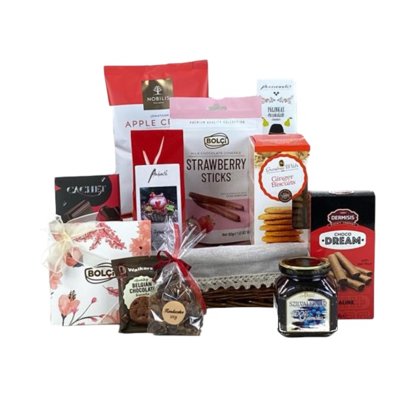 A gondosan válogatott finomságok egy stílusos, mutatós ajándékkosárban kaptak helyet. A csokoládék, kekszek, bonbonok és más ínyencségek tökéletes harmóniát alkotnak – így az ajándék nemcsak finom, hanem esztétikailag is lenyűgöző. Egy ilyen ajándékkosár mindig mosolyt csal az édesanyák és hölgyek arcára.