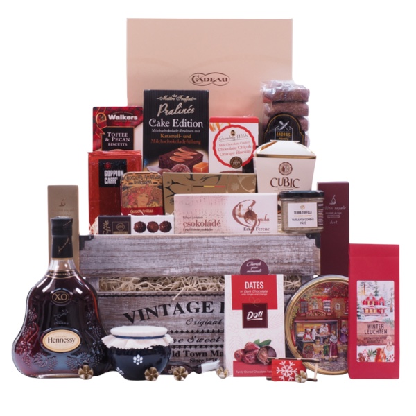 A különleges ital története egészen az ír nemes, Richard Hennessy nevéig nyúlik vissza, aki a Cognac-i borvidéken alapította meg a legendás Hennessy konyakházat. E nemes ital méltó központi eleme ennek az exkluzív ajándékkosárnak.