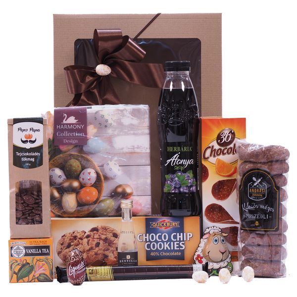 Küldj húsvétra egy finomságokkal teli húsvéti ajándékdobozt nyuszival ajándékba. Találsz benne mézes puszedlit, szörpöt, egy kis pálinkát, kekszet, teát, csokoládékat és egy plüss nyuszit is.