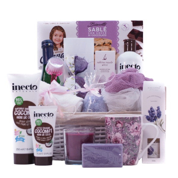 A kosárban gondosan válogatott fürdő- és wellness termékek várják a megajándékozottat – illatos fürdősók, frissítő tusfürdők, testápolók és aromaterápiás kiegészítők, amelyek segítenek lelassulni és új energiát gyűjteni.
