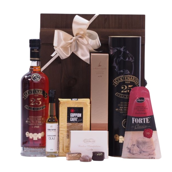 Ez az igényes ajándékcsomag ideális választás születésnapra, névnapra, üzleti meglepetésnek vagy bármilyen ünnepi alkalomra. A prémium Centenario rum mellett helyet kap benne az olasz kávé, a kézműves bonbon, a csokoládéval töltött füge és a karakteres szarvasgombás olaj – mindez elegáns fadobozba rendezve, stílusos és értékes meglepetést alkotva.
